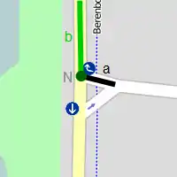 - Das exakte Rendern von Gebotsschildern statt Verbotsschildern ist mit der oben gewählten 1:1-Beziehung zwischen englischem type und dem entsprechenden Gebotszeichen nicht möglich. Beispielsweise müsste ein no_right_turn an einer Kreuzung, wie dargestellt, durch ein Gebotszeichen geradeaus und links dargestellt werden, bei einer nach rechts abgehenden Einmündung dagegen durch ein nur geradeaus. Dies entspricht dann auch der in der Realität üblicherweise gewählten Beschilderung. Mit der oben gewählten, sehr viel einfacher umzusetzenden 1:1-Beziehung, wird dann aber an Einmündungen bei der (zulässigen) Abbildung der Situation durch ein Verbot ein Schild mit Pfeil in eine nicht vorhandene Straße (im Beispiel nach links) dargestellt.