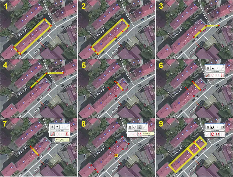 Wenn als Hintergrund in OSM nur grob detailiierte Luftbilder vorliegen, ist das Nachzeichnen der Gebäude schwierig, denn die Größe der Gebäude entspricht fast der Größe der Icons der Konstruktionswerkzeuge. Dies ist die größte Schwierigkeit, wenn man präzise zeichnen will: Die grafische Darstellung der Werkzeuge und Knotenpunkte ist einfach zu groß für die Objekte in dem Kleinmaßstab. Die hier beschriebene Vorgehensweise geht dieses Problem bei rechtwinkligen Gebäuden um. Die Arbeitstechnik ist aufwändig und langsam, liefert jedoch relativ gute Ergebnisse.