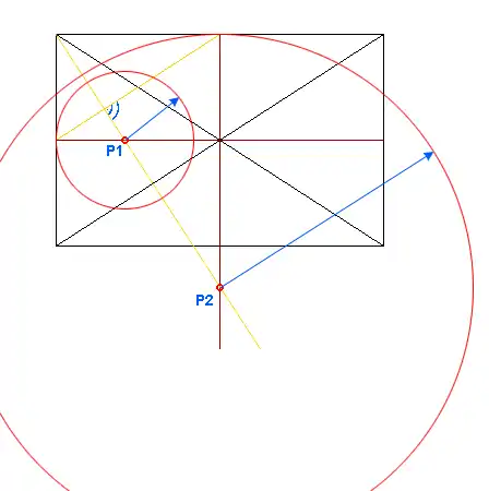 Der Verschneidungspunkt dieser Gerade mit der senkrechten Linie die das Umrißrechteck halbiert ist der Mittelpunkt von dem kleineren Kreis. Auf der Zeichnung ist er in roter Farbe zu sehen.