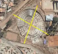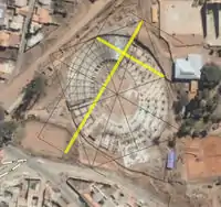 In der linken oberen Ecke des Bildes sehen wir ein Gebäude auf dem Kreuzgrundriß. Ebenfalls dieses Gebäude konnte präziser gezeichnet werden dank einer Drehung um 45° zum Konstruktionsraster.