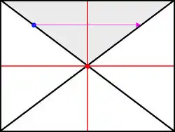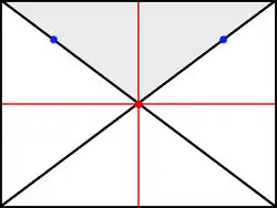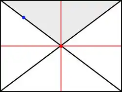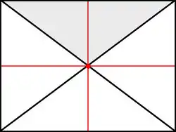 Nun hast Du vier kleinere, identische Rechtrecke. Zeichne fehlende Diagonale von dem kleineren Rechteck, sowie konstruiere aus der rechten, oberen Rechteckecke eine Linie, die senkrecht zu der vorhin gezeichneten Diagonale ist.