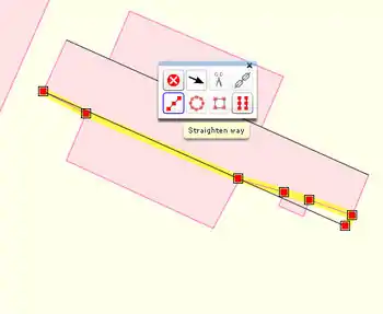 An Stellen an denen sich die Geraden miteinander schneiden, werden Knotenpunkte hinzugefügt. Mit dem Werkzeug "straighten way" müssen danach eine Linie nach der anderen begradigt werden...(die Schwäche von Potlatch ist eine leichte Verschiebung der Punkte die wir als Knotenpunkte an den Wegen hinzugefügt haben)