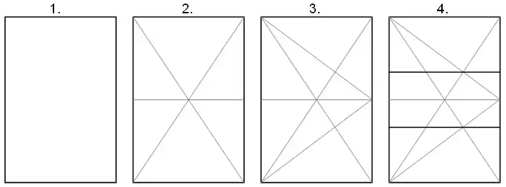 - In die kleineren enstandenen Rechtecke jeweils eine weitere Hilfsdiagonale einzeichnen. Die Schnittpunkte der eben gezeichneten Hilfslinien markieren die Position der hinzu zufügenden parallelen Wege in Grafik 4.