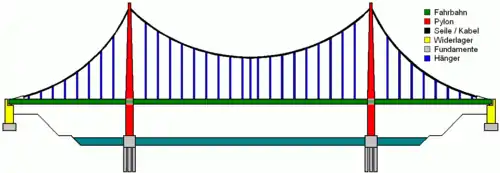Hängebrücke ist eine Brücke bestehend aus Pylonen, über die Tragseile geführt werden, an denen der Fahrbahnträger aufgehängt ist.