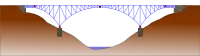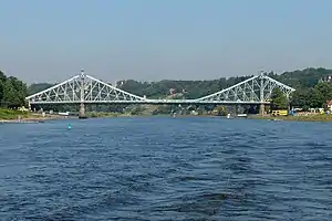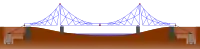 Das Blaue Wunder hat ein sehr spezielles Tragwerk, das in dieser Form nur bei diesem Bauwerk angewandt wurde. Es gleicht einem auf den Kopf gestellten Dreigelenkbogen. Der Erbauer hatte das Ziel, eine Konstruktion ähnlich einer Hängebrücke zu schaffen aber ohne deren Nachteil, dass diese schwanken kann. | |