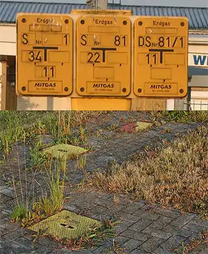 pipeline=valve (Schieber oder Schieberkasten) + substance=water/oil/gas (Wasser, Öl, Erd- oder Ferngas) (optional) + operator=* (optional) + ref=* (optional) + diameter=* (optional) + position=* Position laut Hinweisschild von links nach rechts gelesen (optional)