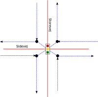 ![]() Figur 9a. Vejkryds mellem to dobbeltsporede veje, med cykelstier i alle retninger, med et enkelt trafiklys. Af pladshensyn er der ikke tegnet pile på forbindelserne til det centrale knudepunkt. |