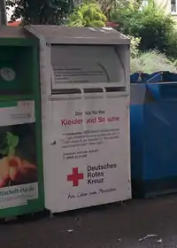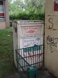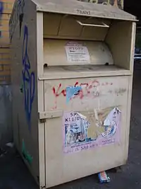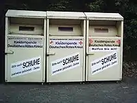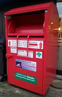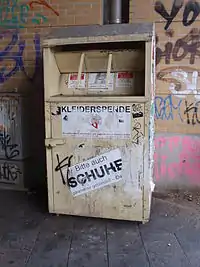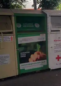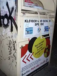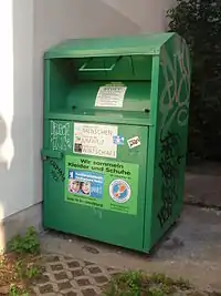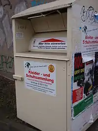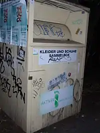 Einige Altkleider-Container tragen weder Aufkleber noch Beschriftung, die Rückschlüsse auf den Betreiber zulassen würden. Diese tragen stattdessen generische Aufkleber mit folgenden Texten: