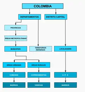 - Para el listado de divisiones políticas en Colombia se puede ver el artículo: ES:Colombia/Listado división política. Ahí están listados todos los elementos que conforman la división política.