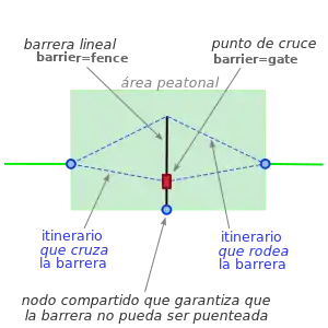 - Cuando una barrera lineal se ubica en la unión entre dos áreas peatonales continuas (por ejemplo, una valla entre una plaza y un parque), comparte sus nodos con ambas áreas.