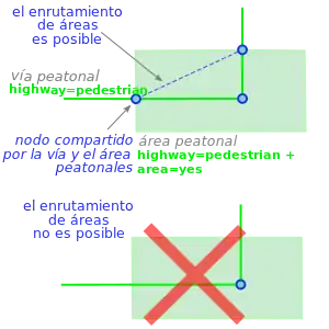 Cuando varias áreas peatonales sean contiguas, deben compartir nodos a lo largo de su unión – esto ayuda a los motores de enrutamiento a considerarlas como un área única.