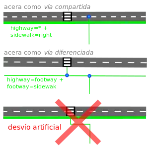 Una acera se puede mapear como una vía peatonal (highway=footway + footway=sidewalk) o como una vía compartida (highway=* + sidewalk=left/right/both). Se puede proporcionar más información en aceras diferenciadas, por ejemplo, la altura de los bordillos con kerb=* y la presencia de tactile_paving=*. La página Aceras describe ambos enfoques.