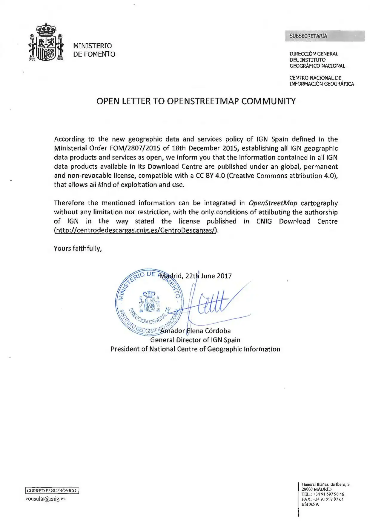 En esta carta enviada a la OSM Fundation, el IGN autoriza expresamente a OSM al uso de los productos bajo licencia CC BY 4.0