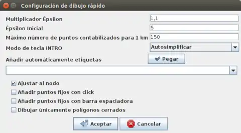 - Al arrastrar y hacer clic cerca de nodos existentes estos se pueden incluir automáticamente en la línea dibujada (quedan como puntos fijos y no se cambian por la simplificación). Puedes desactivar este comportamiento en los ajustes (tecla Q) .