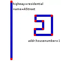 <way id="1"> <tag k="addr:housenumber" v="10" /> <tag k="building" v="(yes|apartments|...)" /> </way>