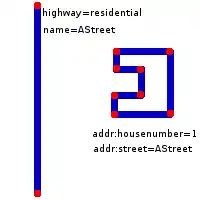 Solo los viales con la etiqueta "highway" pueden ser consideradas como calles (esta forma no asocia el número de portal con polilíneas que representen una barrera, muro o línea eléctrica por ejemplo).