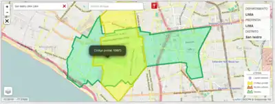 En Lima, el código postal proviene de un sector y no de un distrito. Por ejemplo 15073 es el código del sector centro de San Isidro que encapsula también al golf (en la imagen).