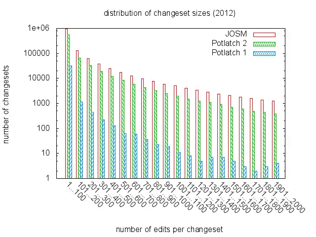 - It is obvious that according to the number of edits, JOSM has never been challenged as the number one editor (the only nominal exception in 2009 being a special case, when huge numbers of superfluous tags from the TIGER import were removed by woodpeck_fixbot using osmtools, and with changesets from before API 0.6 that can not be associated with any editor). JOSM's dominance is not so clear in terms of changesets created - this has to do with Potlatch 1 creating zillions of empty changesets in live editing mode, but also with the fact that Potlatch users tend to make smaller changesets on average, and iD users creating even smaller changesets than Potlatch 2 users.