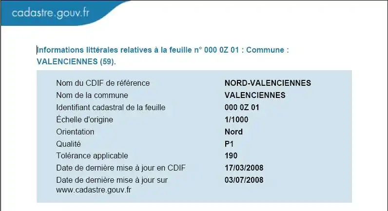 Le problème est que plusieurs feuilles composent une même voie de circulation et peuvent ne pas posséder la même date. De plus il n'y pas de délimitations des parcelles/feuilles dans OSM mais seulement des limites administratives, ce qui pose le problème ci-après : Comment savoir si telle portion de voie appartient à telle feuille ou telle autre ?. Sans doute faut-il comprendre que la date à rattacher aux données provenant du cadastre est celle de la feuille par défaut proposé par le site web du cadastre. Pour Valenciennes (59 NORD), le pdf par défaut pour la commune est la parcelle 000 AL 01.