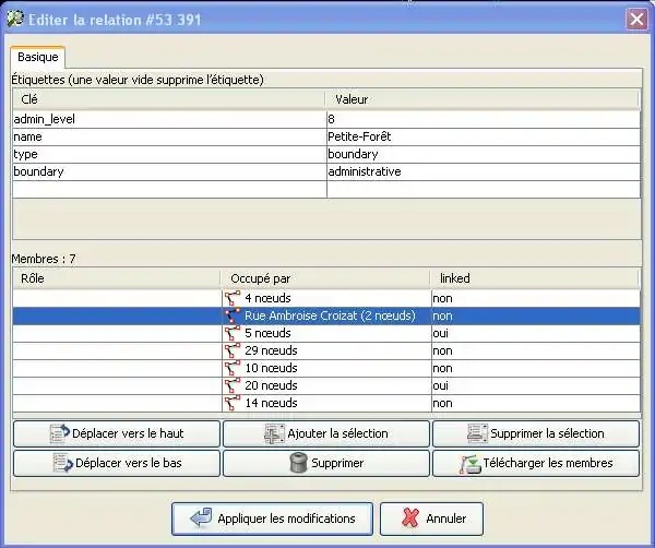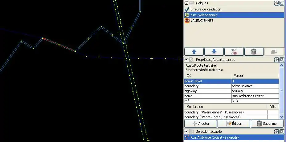 - que ce trait est membre des 2 communes Valenciennes et Petite-Forêt. Si on clique sur 'boundary ("Petite-Forêt", 7 membres)' puis sur le bouton édition on comprend la nature des informations rattachées à une limite communale donnée.