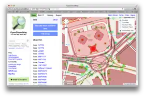Une zone de données brutes peut être chargée dans la zone visible de la carte, et les éléments bruts des données d'OpenStreetMap (nœuds et chemin) peuvent être sélectionnés soit par clic sur la carte elle-même, ou bien dans la liste des objets présentée sur le panneau de gauche.