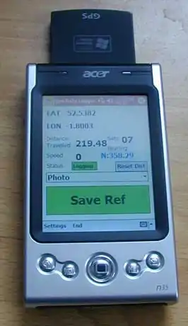 DétailsAcer n35 GPS![]() Acer n35 running GPS Data Logger The Acer is primarily a conventional relatively low spec Pocket PC PDA with built in GPS receiver and Destinator Maps (UK and Ireland maps provided in the price here in the UK). To turn it into a logging device while using the Navigation software I needed to duplicate the GPS COM port which is being achieved without problems to date using GPSGate from Franson in Sweden (US$29.95 for the Standard version, US$9.95 for the Express version). This software provides virtual COM ports for the GPS receiver so that more than one software package can access the GPS receiver at the same time. For more on using an Acer n35 GPS see Blackadder's page. User:Steevc also has one. The Acer n35 is almost identical to the Navman PiN 570 GPS receiver, with the software being the main difference. Christer Weinigel was able in the spring 2005 to run Linux on the Acer n30 PDA. See also the handhelds.org wiki for the n30. The n35 is a follow-up to the n30. Where the n30 had a Bluetooth chip, the n35 has the GPS receiver chip. The Destinator (v. 3 and up) software is able to log by itself. You get a binary format which is described by Jonas Svensson, that page also includes a plain converter. Currently you lose information about number of satellites and how good the position is, but may be an alternative if you do not wish to use extra software. The N35 is known to have problems with the power/USB connectors with time. So after months of usage (specially in a car) the connector on the N35 will loose contact with the mother board , and the N35 battery will not be recharged nor it will be recognized in the computer. Link Acer N50![]() an Acer N50 with a Bt-77 antenna Acer N50 is a normal PDA without an integrated GPS antenna. User EdoM use it coupled with a BT-77 Bluetooth antenna and VisualGPSce to track his movements. Adapt (general)Adapt now has its own page. Alan (general)