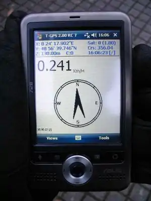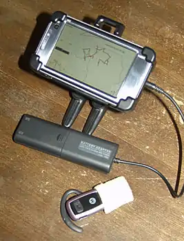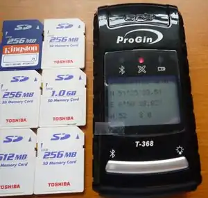 Works very well in combination with gpsd on Linux. Very cheap, but comes with minimal documentation and without software. It is also possible (although unlikely, and this is not a specific risk for this particular device but probably for each "gpsmouse" device) to mess up the settings in such a way that one cannot connect any more with the device, leaving one no solution but to open it and disconnect the battery (which is soldered) to reset the device to its factory defaults. Of course this voids your warranty. See also the utility SirfDemo. Navilock BT-359![]() Navilock BT-359 beside a Nokia 6300 running GPS Track It's the same as the Globalsat BT-359 (except the logo). Connection: Bluetooth