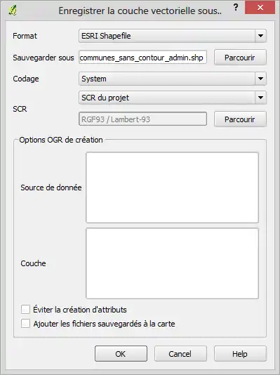 - Sélectionner Jeu de données : aller chercher le fichier ./GEOFLA_2-2_COMMUNE_SHP_LAMB93_FXX_2016-06-28/GEOFLA/1_DONNEES_LIVRAISON_2016-06-00236/GEOFLA_2-2_SHP_LAMB93_FR-ED161/COMMUNE/COMMUNE.shp dans l'archive décompressée