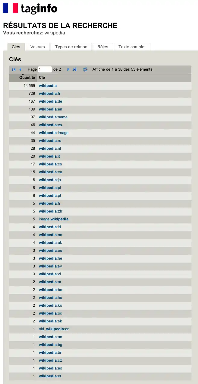 D'après tag info, il y avait 14569 tags wikipedia (ainsi que 729 "fr", 167 "de", 139 "en", 46 "es") au 2/3/2013.