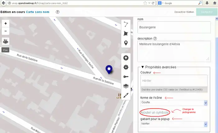 Pour changer la couleur et la forme du point, cliquez sur "Propriétés avancées". Vous pourrez également changer le pictogramme présent à l'intérieur du point ainsi que le gabarit du pop up.