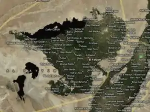 The region is mostly an agricultural area, its fertility provided by a series of irrigation canals which are intricately spread across the depression to supplement the natural wells and springs of the oasis. A wide variety of crops can be seen, depending on the season - the main one being cotton, but there is also wheat, rice, tomatoes and a large selection of fruit and vegetables. Much of the cultivated land is covered by groves of palm trees, for every part of the palm is of use. Text from http://egyptsites.wordpress.com/2009/02/15/introduction-to-el-faiyum Image from http://www.bing.com/maps |