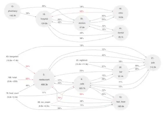 - English : How do amenity tags change? A detailed analysis by Matias Dahl involved mining the Planet.osm/full history dumps to produce diagrams like this revealing internal relationships between the tags.