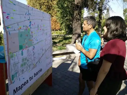 - English : For OpenDataDay 2016 in Santiago, Chile they asked passers-by in a public square to put sticky notes over a big printed OpenStreetMap map. Read more on this OKFN blog post.