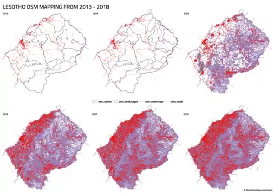 - English : Tremendous progress from 2013 to 2018 in the African country of Lesotho, mapping roads (red), and waterways (purple). Learn more on the MapLesotho site