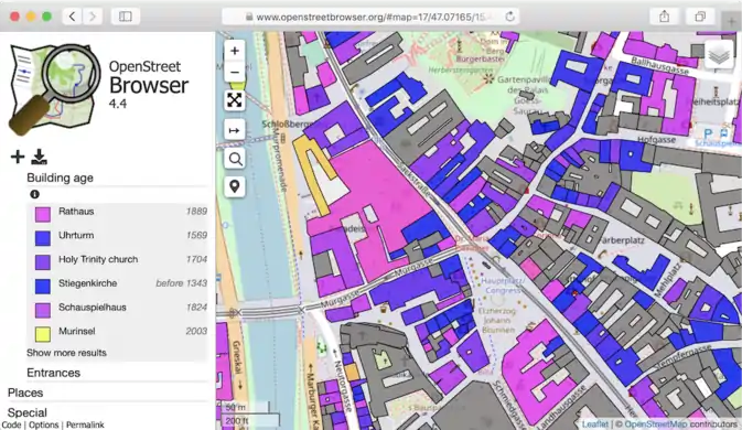 - English : OpenStreetBrowser recently added new features including colourising by building age, which looks great in places where it is mapped (with Key:start_date), such has here in Graz, Austria