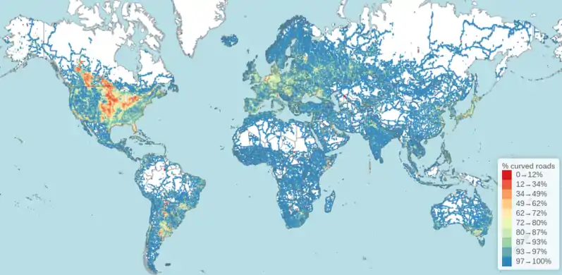 - English : Rory McCann analysed OpenStreetMap data to create this visualisation which answers the question "Where in the world has the straightest roads?