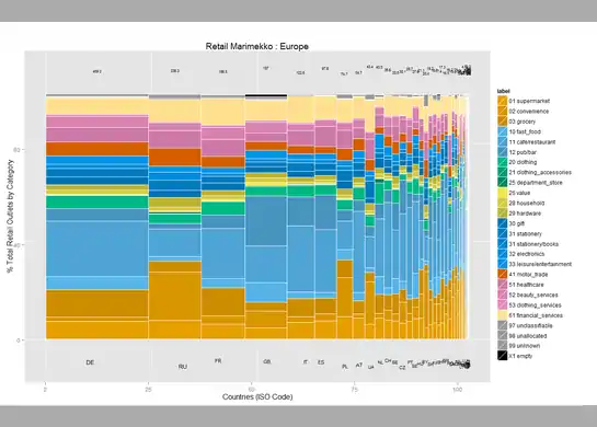 - English : User:SK53 has been investigating retail POI data, looking at the stats by country, and plotting this in a variety of ways. Read more on his blog post. This "Marimekko" diagram shows different retail types (shop tags) in different European countries.