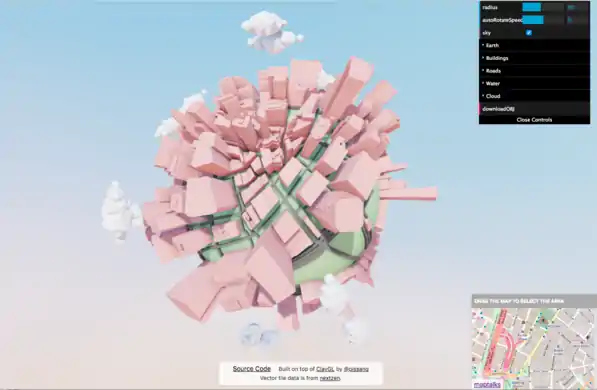 - English : Little Big City, “Generating city on a little planet on the web”: a project by Yi Shen, using OpenStreetMap data via Nextzen vector tiles.