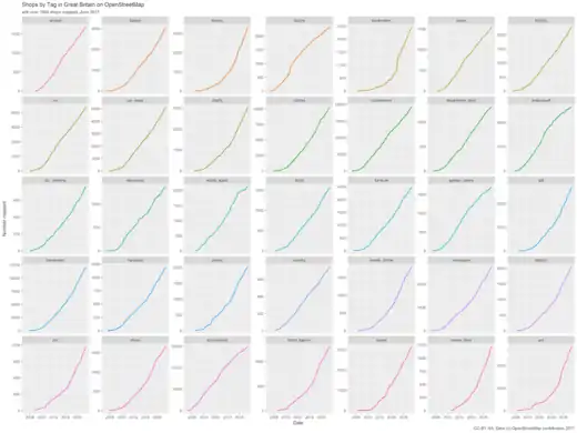 - English : "Accumulation curves" showing the growth of shops data in the UK by SK53. This image shows a graph for each of the top shop types while his recent blog post compares and analyses growth shapes in various other ways.