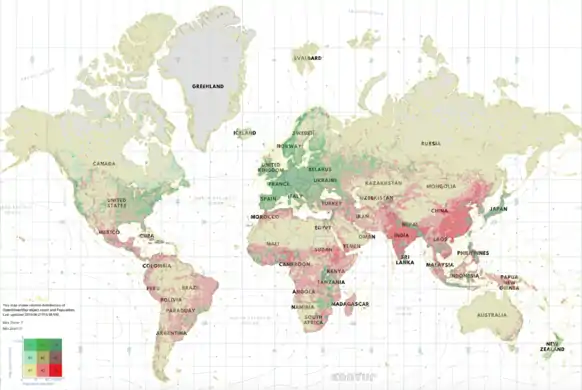 - English : This map by Kontur, appearing on a new tool called Disaster Ninja, shows relative distribution of OpenStreetMap object count vs Population. Green means relatively more OpenStreetMap data, Red means relatively more (less well mapped) population.