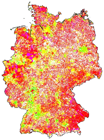 - English : The "speed index" map of Germany. Kumakyoo devised this index, taking an average speed limit of roads within the area of every community, to produce this map indicating pedestrian friendliness