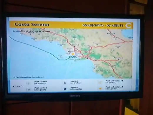 - English : On Costa cruises, passengers can visualise the progress of the ships on many screens (inside the cabin, on interactive screens) featuring maps from OpenStreetMap