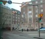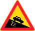 Huomaa myös, että vasemmanpuoleinen kolmio on kapeammalla reunuksella ja vanhan asetuksen (ennen vuotta 1982) mukainen; merkki olisi pitänyt vaihtaa uuteen vuoteen 1994 mennessä. Tässä merkitys ei muutu, koska on myös voimassaoleva merkki. |
