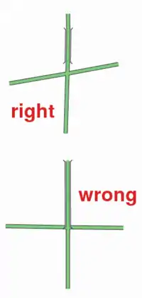 | Jokaista risteystä kohden tulisi olla piste risteyksen kohdalla ja pisteen tulee kuulua kumpaankin risteävistä teistä. Jos risteyksessä on mahdollista kulkea tieltä toiselle, on väärin piirtää toisen tien piste hieman risteävästä tiestä sivuun - tämä voi näyttää kartalla oikealta, mutta loogisesti ja esimerkiksi reititysohjelmien kannalta risteävien teiden yhteys puuttuu. | ![]() T-risteys oikein piirrettynä ![]() Väärin piirretty T-risteys |
