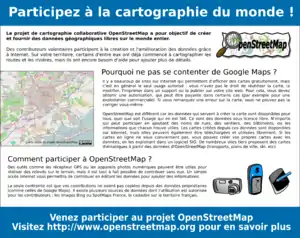 Tout le monde connait les cartes IGN et sur internet, les services Google Maps, Mappy, Via Michelin... Depuis 2004, un projet collaboratif nommé OpenStreetMap (OSM) a été créé avec pour objectif de construire une base de données cartographiques du monde.
