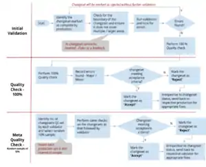 Different validators other than production ops will perform a quality check. Follow the same process as that of production, while validating 100% of changesets marked as complete. Record the errors found and segregate basis Major and Minor errors -