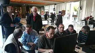 En outre, Jérôme et Guillaume ont co-animé l'atelier de 10 h géolocalisation Wikimédia / OpenStreetMap le matin, avec Letizia pour Wikimedia. Peu de monde : 3 participants seulement, mais plutôt intéressés par OSM (notamment BANO).