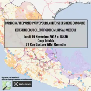 - Fondé en 2014 à Mexico, le collectif GeoComunes (site en espagnol) s’est spécialisé dans la cartographie participative pour la défense des biens communs. Le travail du collectif consiste à accompagner des luttes dans différentes parties du Mexique en réalisant des exercices de cartographie participative qui permettent d'informer la population sur les méga-projets existants sur leur territoire (mines, barrages, autoroutes, projets pétroliers, etc), d'identifier les biens communs menacés (rivières, terres agricoles, lieux sacrés, etc.) et d'effectuer des analyses géopolitiques régionales permettant de comprendre les liens existants entre les méga-projets. Les cartes et analyses réalisées s'intègrent ensuite dans les différentes stratégies de lutte des communautés (sensibilisation locale, diffusion dans les médias, actions juridiques, etc.).