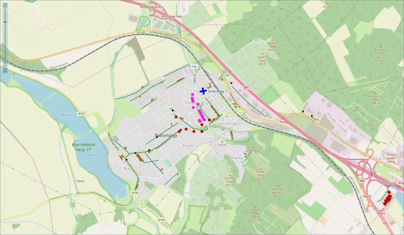 • Biatorbágy térképes nyilvántartásai: Kataszteri nyilvántartás házszámokkal és telekhatárokkal (OpenStreetMap háttér réteg felett közvetlenül látszanak az eltérések!), természeti és építészeti értékek, közművek, építési övezetek, védett objektumok, településkép. Figyelem: már távolról is lehet benne találni házszám hibákat ezért még ellenőrzésre is csak másodlagos forrásokkal alkalmas!