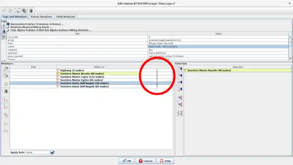 È importante anche correggere l'ordine l'inserimento dei vari tratti, con JOSM è possibile farlo nella finestra di modifica delle relazioni.